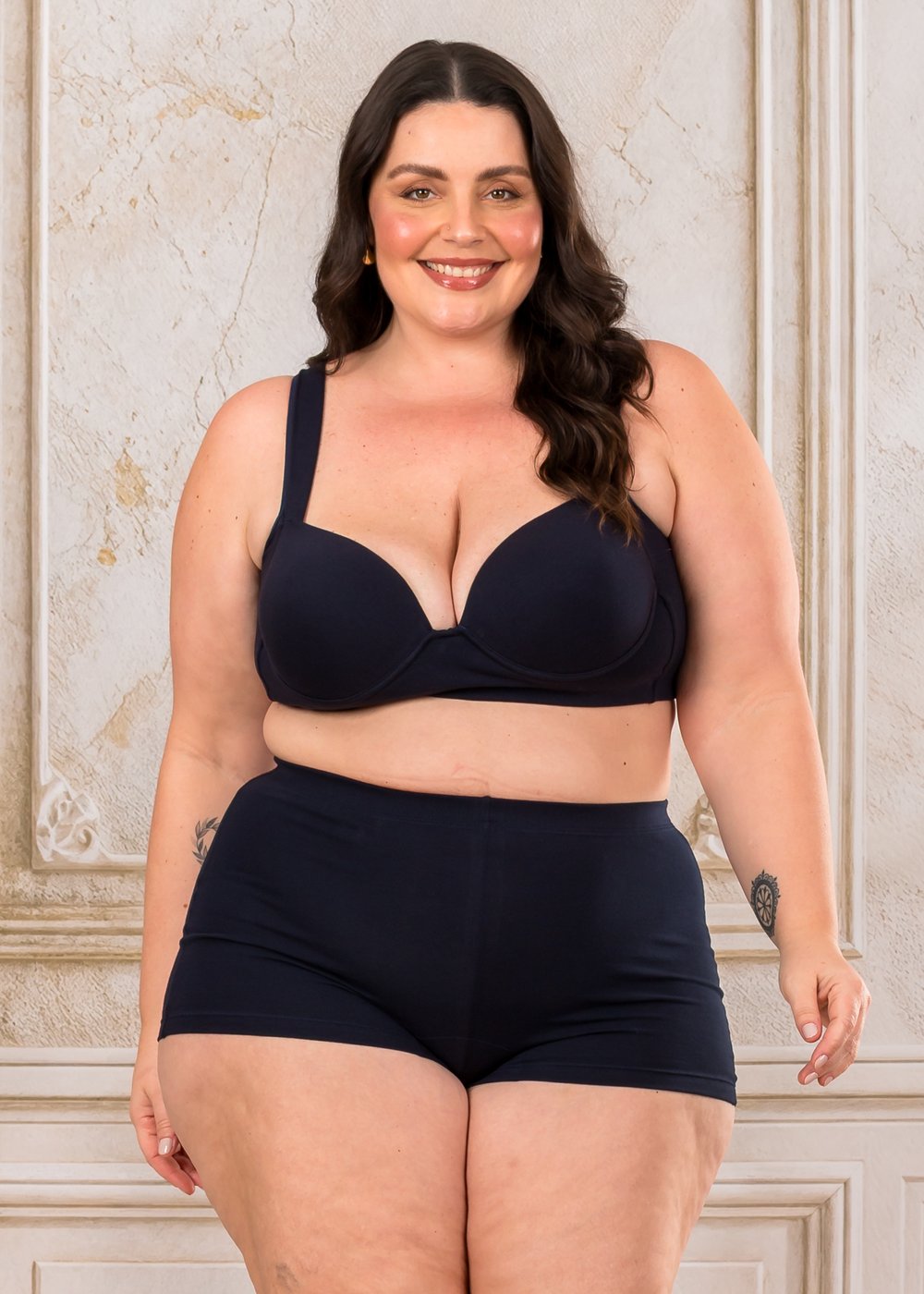 Diferente de outras modelagens, essa peça não cobre o atrito entre as pernas, mas oferece cobertura total do bumbum e do abdômen, trazendo firmeza sem apertar. O cós largo com elástico embutido garante sustentação sem desconforto, adaptando-se perfeitamente ao corpo.